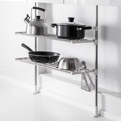 突っ張る力で支えているので、しっかり固定すれば重い調理器具も安心して置けるのがポイント。
